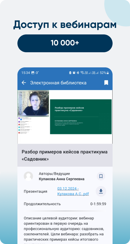 Доступ к учебным материалам навсегда после успешного окончания курса. Участие в вебинарах онлайн и доступ к 13000+ записям вебинаров во время обучения и 90 дней после окончания обучения.