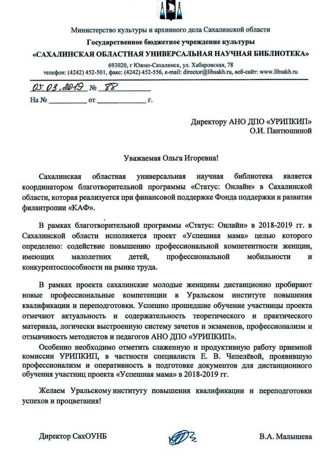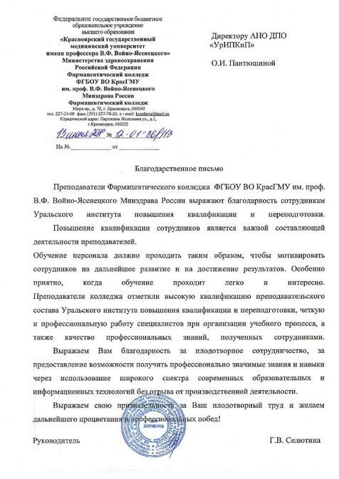 Доброго времени суток.Я прошла обучение в Уральском институте повышения квалификации и переподготовки по специальности «Психологическое консультирование и психодиагностика». Хочу выразить благодарность всем моим преподавателям: Коломейцевой Лидии Владимировне, Перевязко Елене Александровне, Матюшкиной Елене Яковлевне, Мешковой Екатерине Алексеевне, Полуэктовой Ольге Геннадьевне, Ждановой Ирине Михайловне, Богдановой Наталье Александровне, Расуловой Екатерине Владимировне, Русаковой Наталии Васильевне за прекрасно поданный материал, который очень хорошо и понятно усваивался, за отзывы по практическим заданиям, за оперативность, чуткость и благожелательность. Также хочу выразить благодарность техническому и учебному отделу по сопровождению на всём пути обучения. Как только у меня возникал вопрос и я звонила в любой из отделов, всегда тут же мне очень доброжелательно, участливо отвечали сотрудники и я чувствовала, что моим обучением заинтересованы и действительно хотят помочь. И я всегда получала ответ и помощь в любое время.Благодаря всем этим составляющим процесс обучения для был очень приятным, удобным, интересным.А также мне очень понравилось, что было много живых вебинаров по разным дисциплинам и темам. Я выбирала те , которые мне интересны и с удовольствием и пользой для себя участвовала в вебинарах и получила Сертификаты о том, что прослушала и на какую тему. Те вебинары, в которых я не могла участвовать , могла посмотреть в библиотеке уже в записи.Это тоже очень удобно. Обучение было комфортным, качественным и мне очень понравилось, так как могла проходить его в удобном для себя графике. Знания даются качественно и только от себя самого зависит чему и как ты научишься. Благодарю!!!